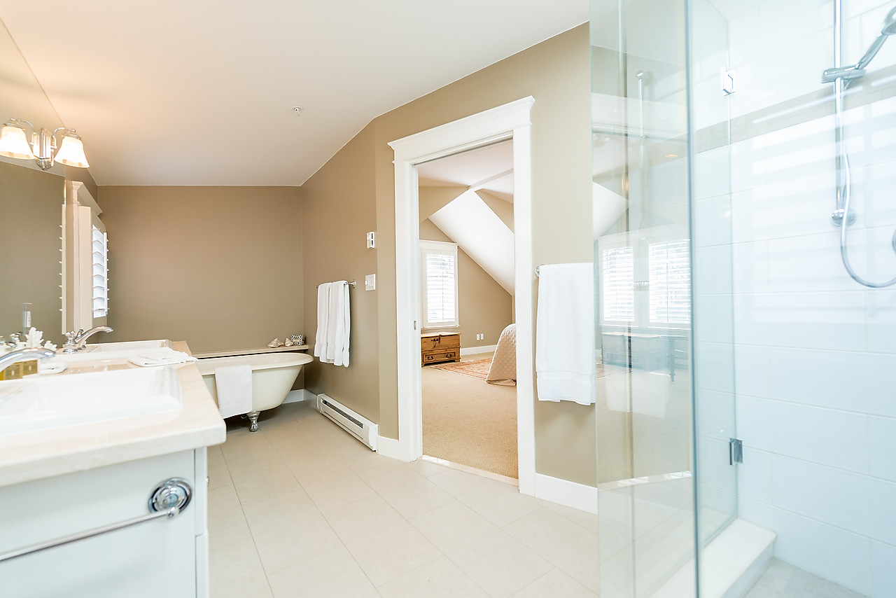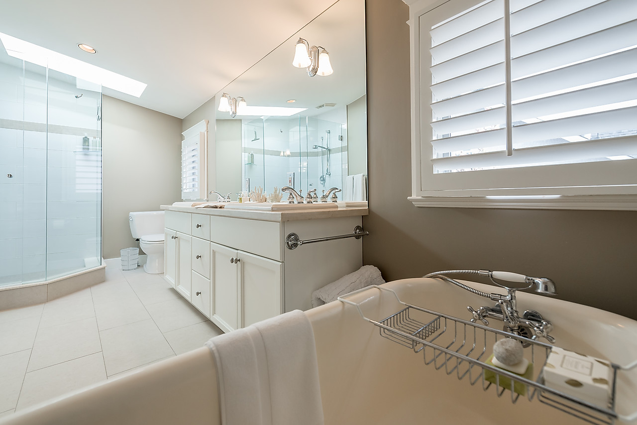 - Luxurious skylit master bathroom with stone counters, double sinks, heritage style claw foot tub and seamless glass shower