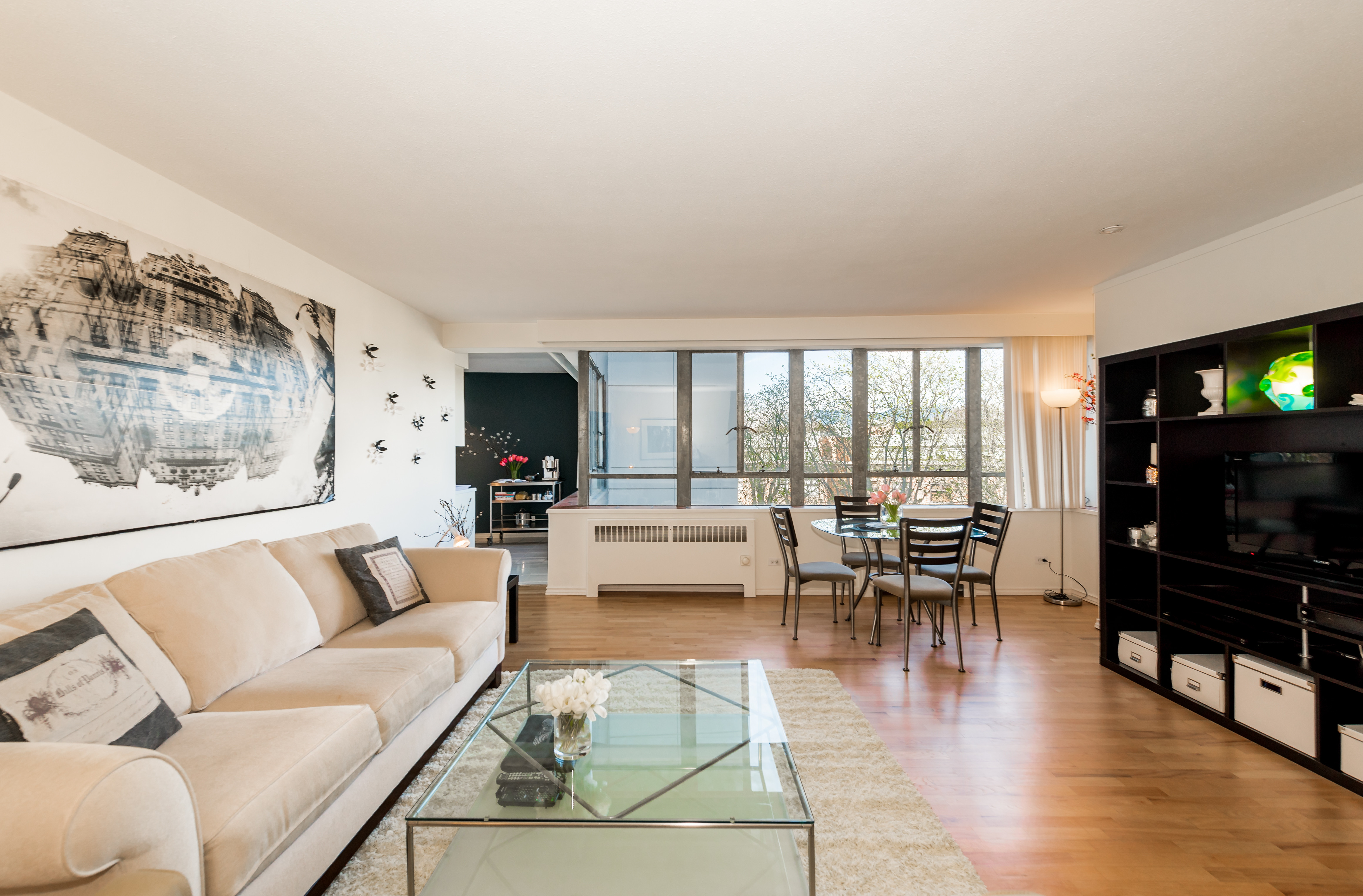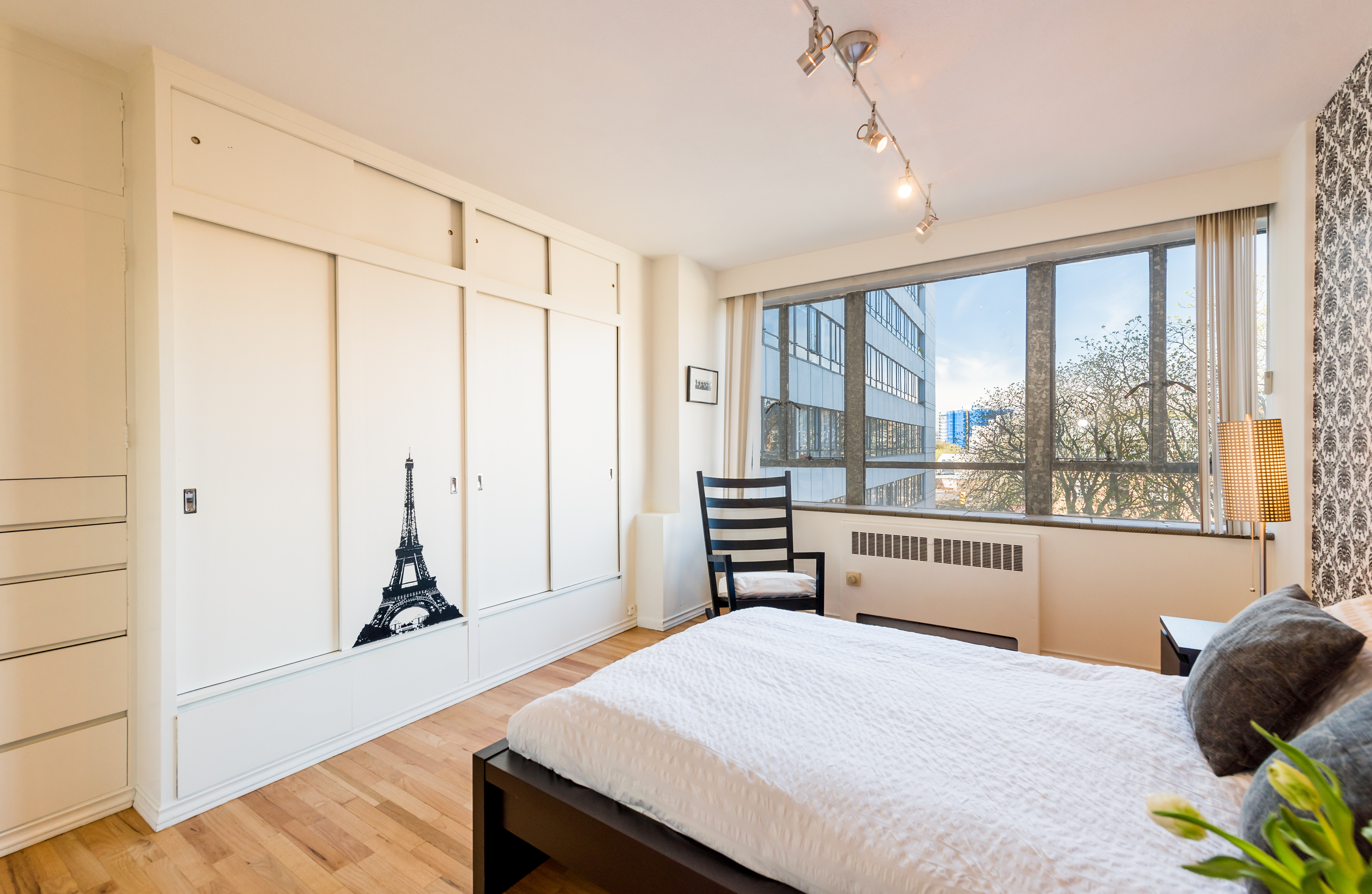 Super SPACIOUS and BRIGHT 1-bedroom suite on the coveted QUIET SIDE of Vancouver's well-respected landmark Hycroft Towers. The perfect location, right on the edge of leafy First Shaughnessy, with everything you need at your doorstep, and just minutes to downtown. The fantastic open plan and 35' of windows make this suite feel huge! Bring your house-sized furniture. Lovely refinished oak floors, tons of in-suite storage, updated bathroom and a huge locker as well. Watch the