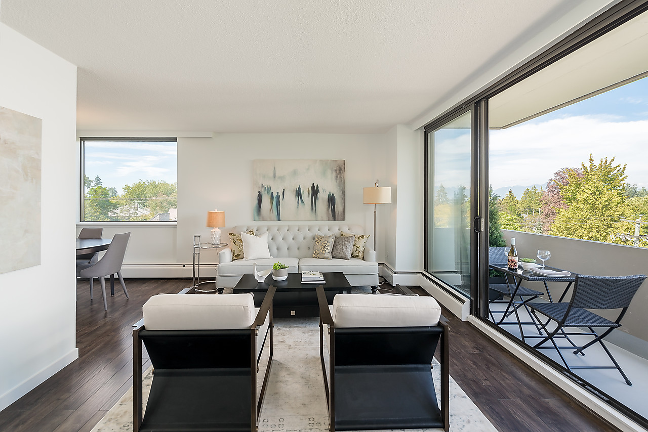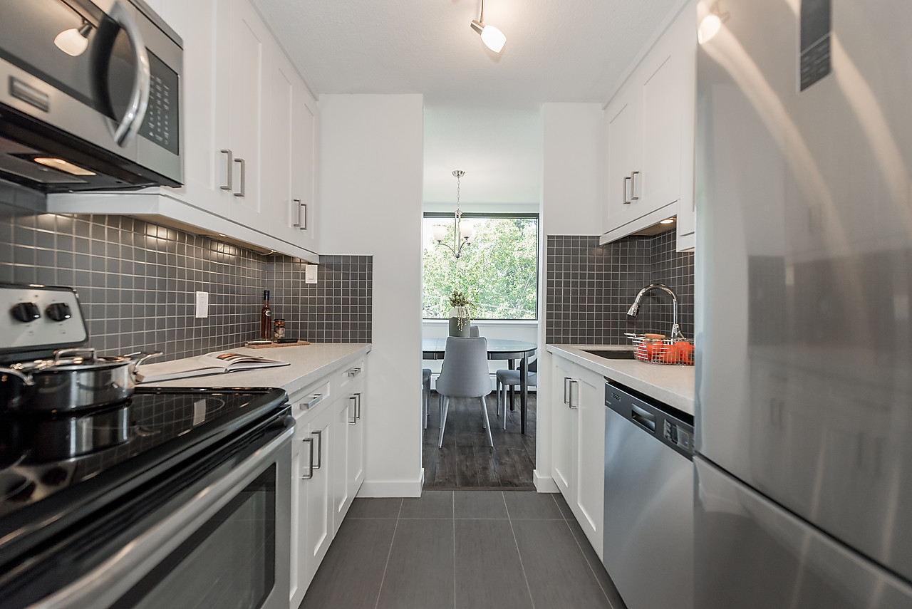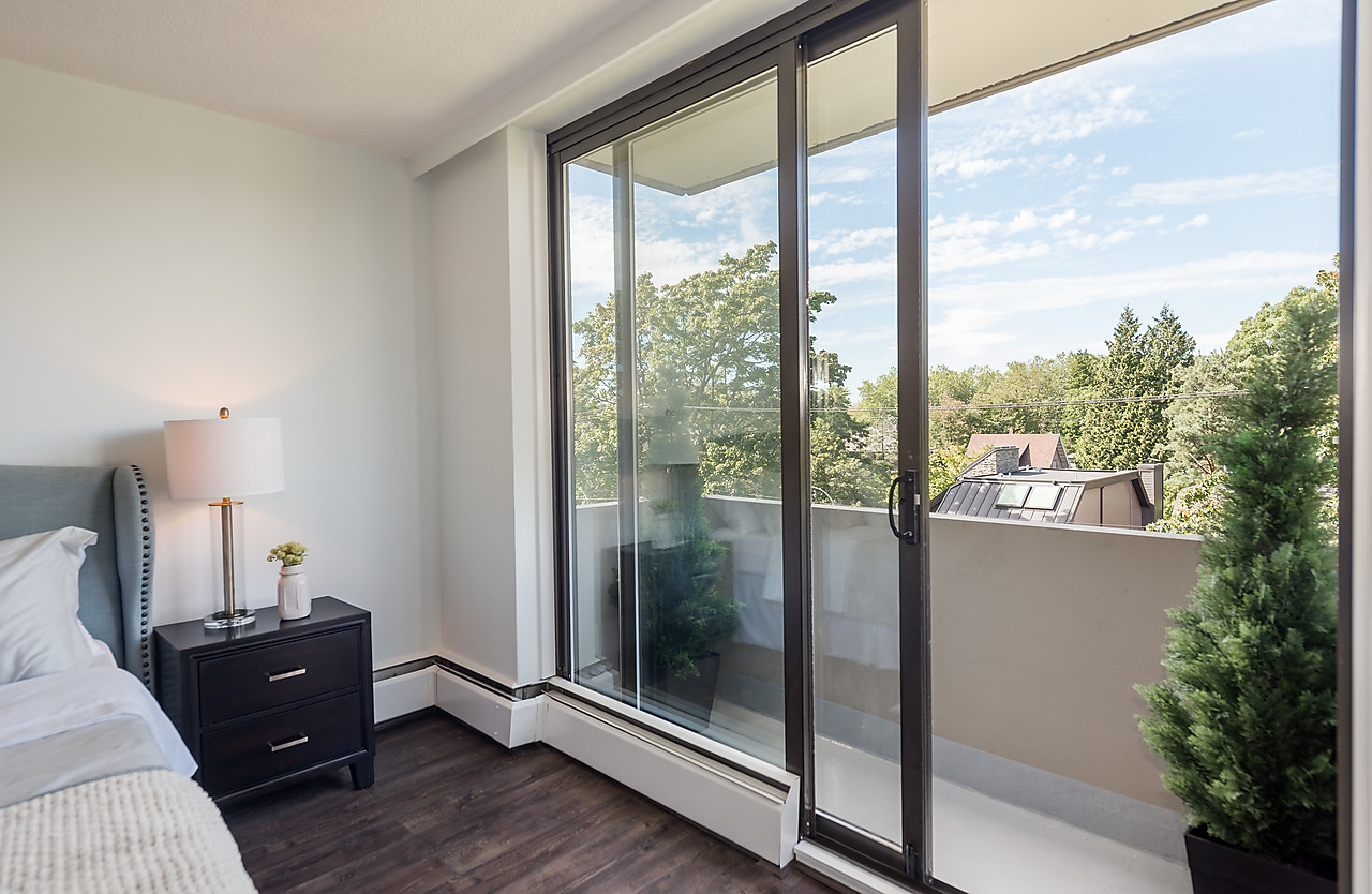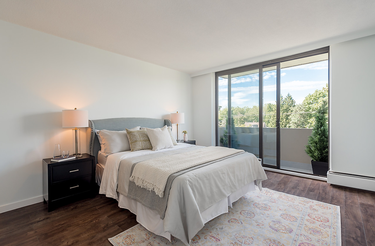 COMPLETELY AND TASTEFULLY RENOVATED! Perched above the tree tops on a quiet tree-lined street in Kerrisdale this tranquil and bright 2 bedroom, 2 full bathroom, corner suite features brand news floors, new kitchen with all new appliances, sparkling new bathrooms, new light fixtures, updated electrical, and fresh paint throughout. The spacious 880sqft floor plan offers large rooms for house-sized furniture and two good-sized, well-separated bedrooms including a king-sized master bedroom with ensuite bathroom.
