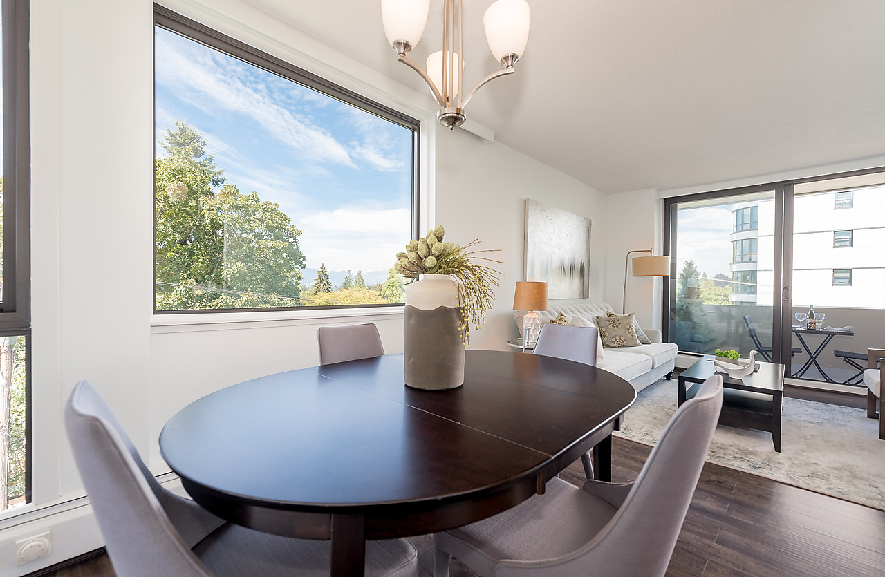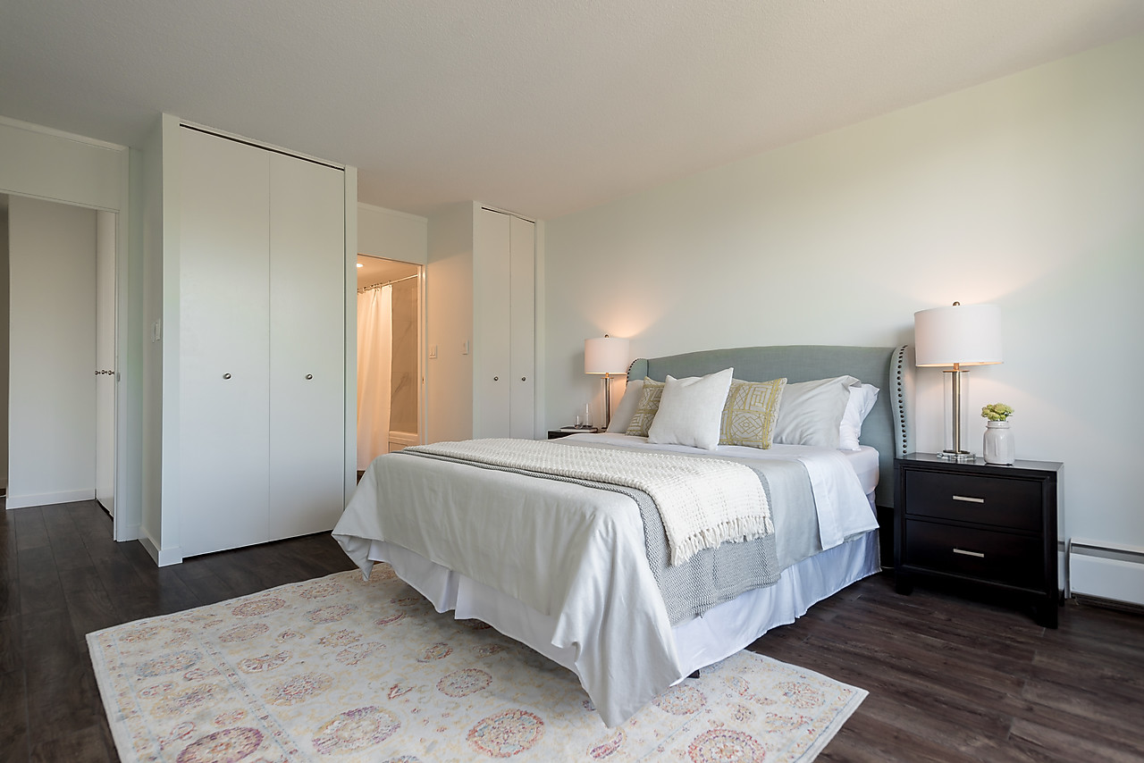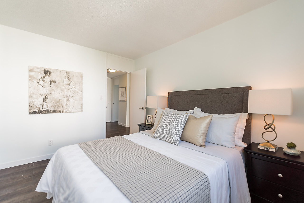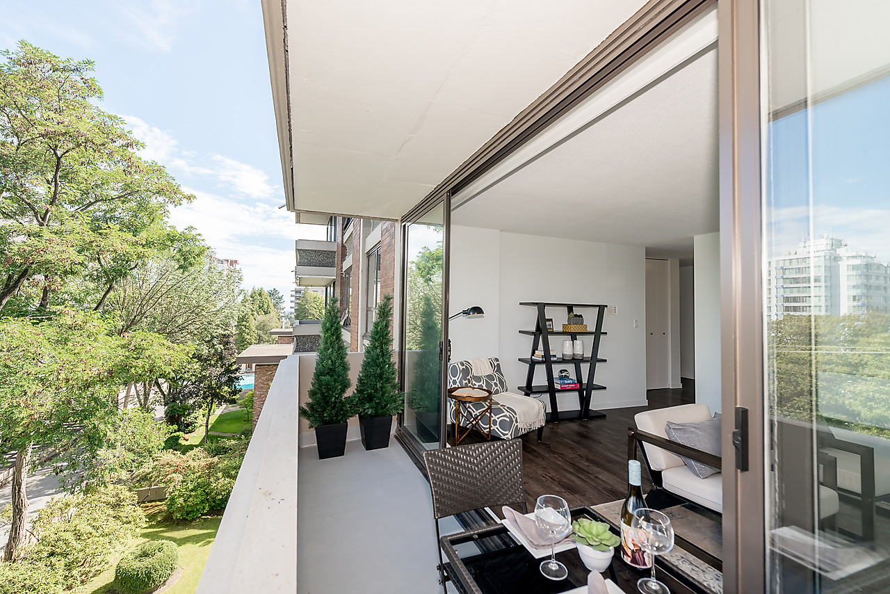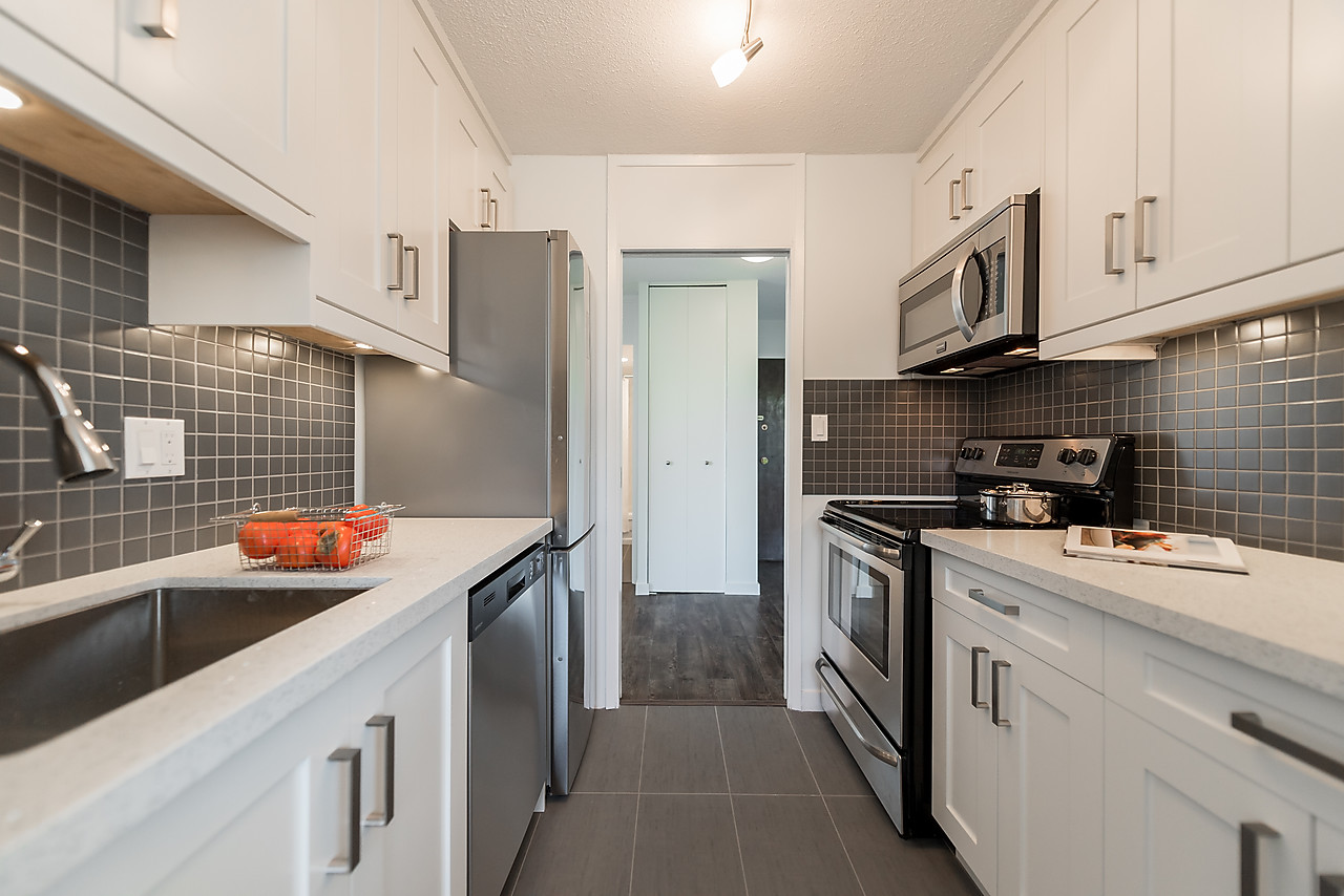 COMPLETELY AND TASTEFULLY RENOVATED! Perched above the tree tops on a quiet tree-lined street in Kerrisdale this tranquil and bright 2 bedroom, 2 full bathroom, corner suite features brand news floors, new kitchen with all new appliances, sparkling new bathrooms, new light fixtures, updated electrical, and fresh paint throughout. The spacious 880sqft floor plan offers large rooms for house-sized furniture and two good-sized, well-separated bedrooms including a king-sized master bedroom with ensuite bathroom.