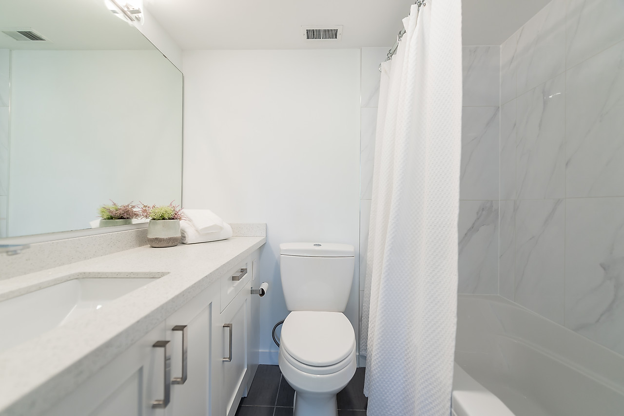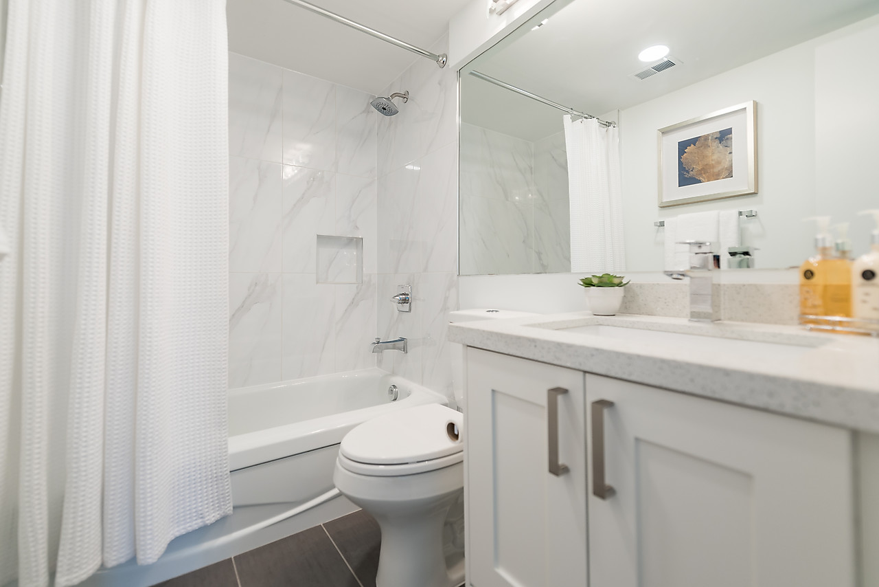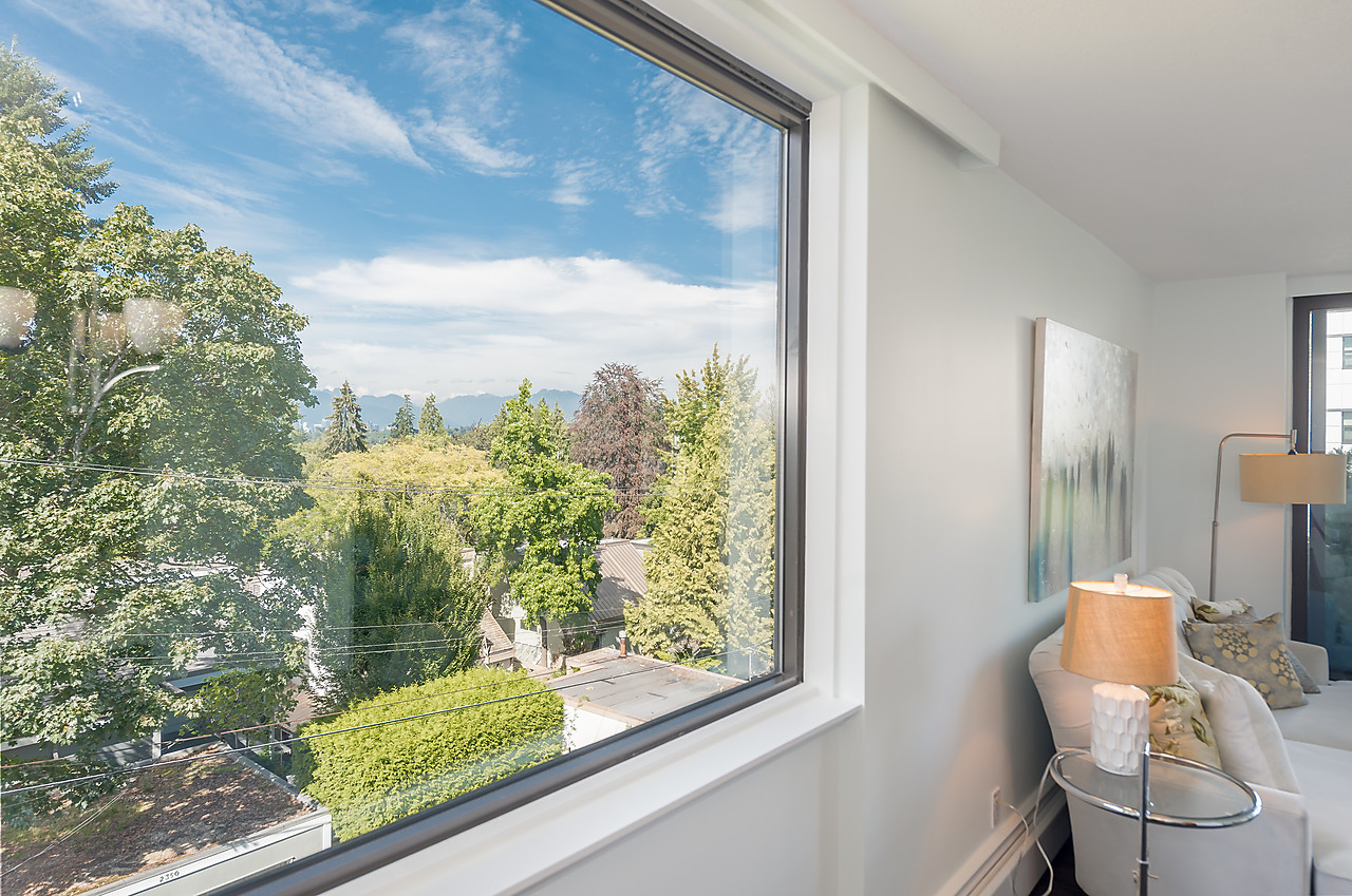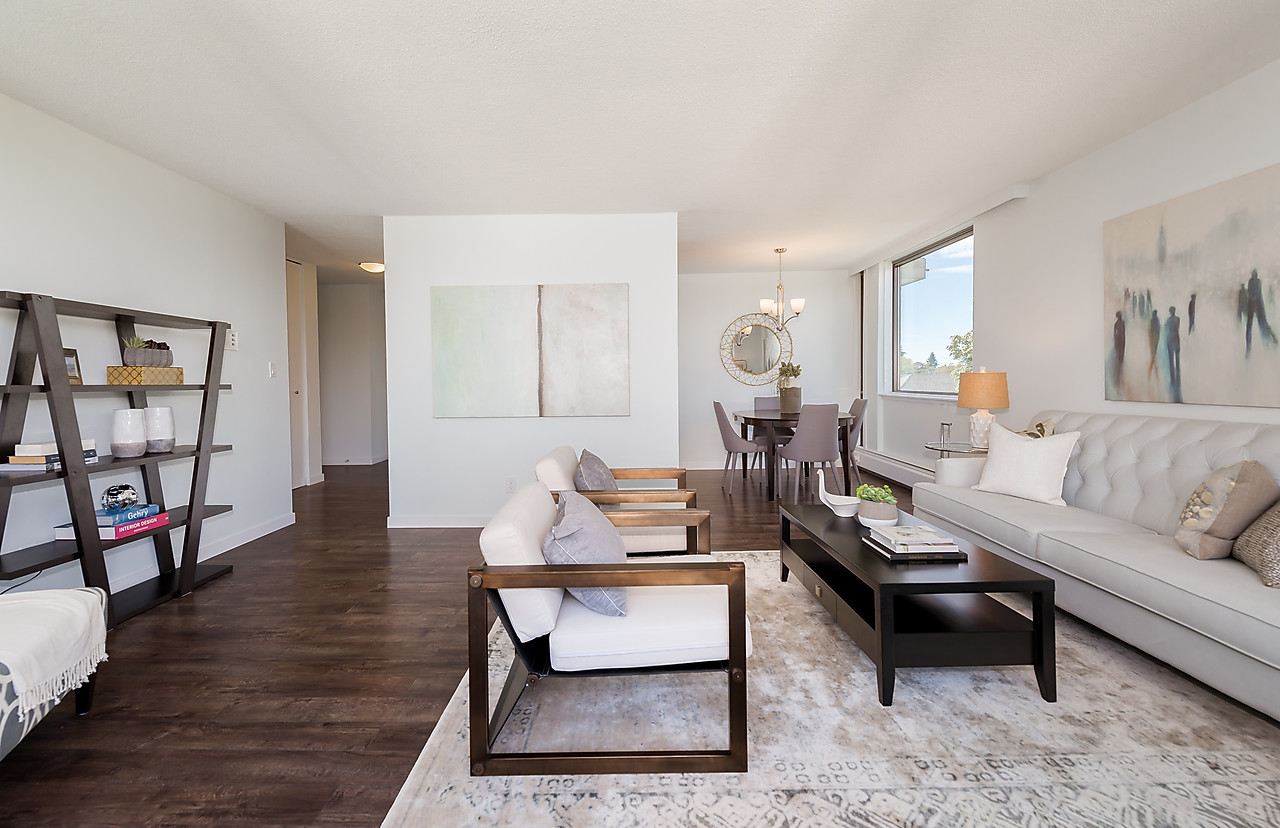COMPLETELY AND TASTEFULLY RENOVATED! Perched above the tree tops on a quiet tree-lined street in Kerrisdale this tranquil and bright 2 bedroom, 2 full bathroom, corner suite features brand news floors, new kitchen with all new appliances, sparkling new bathrooms, new light fixtures, updated electrical, and fresh paint throughout. The spacious 880sqft floor plan offers large rooms for house-sized furniture and two good-sized, well-separated bedrooms including a king-sized master bedroom with ensuite bathroom.