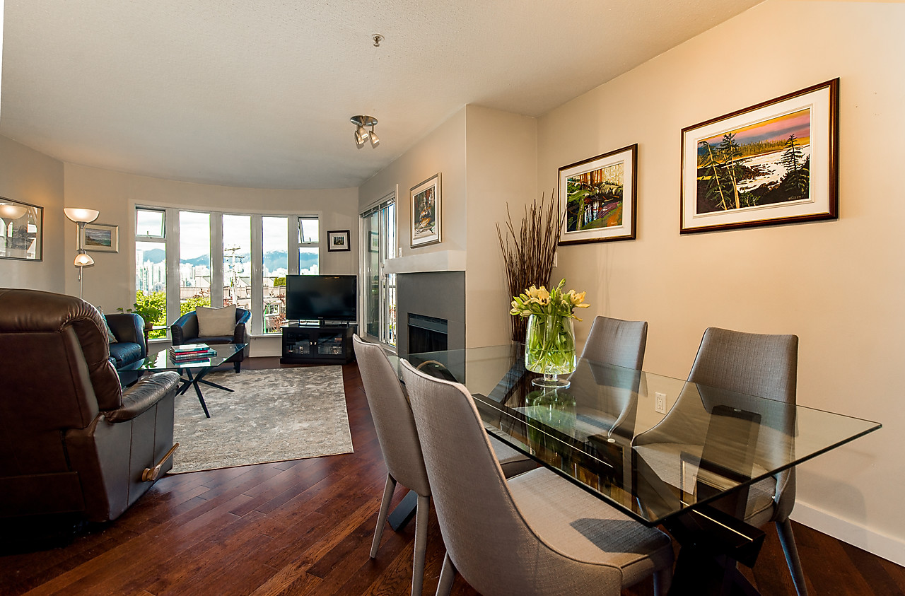 Enjoy fabulous city, mountain and False Creek VIEWS from this spacious and well laid-out 2 bedroom, 2 full bath renovated condo in the well managed and fully RAIN SCREENED Galleria II. Tons of tasteful touches, including a beautifully updated kitchen with granite counters, breakfast bar, stainless steel appliances and tons of storage, updated bathrooms, hardwood floors, a cozy wood-burning fireplace, abundant storage, quality built-ins, Murphy bed and 2 balconies! Perfect location, a short walk to the Seawall, Granville Island and every convenience. 2 pets welcome and rentals allowed. And did we mention the VIEW!